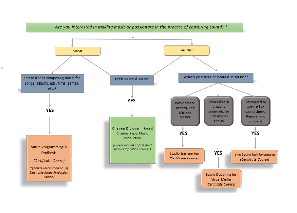 Check out the below chart to make things clearer which will help you to get some clarity about the different courses and subjects related to Sound Engineering & Music Production courses.